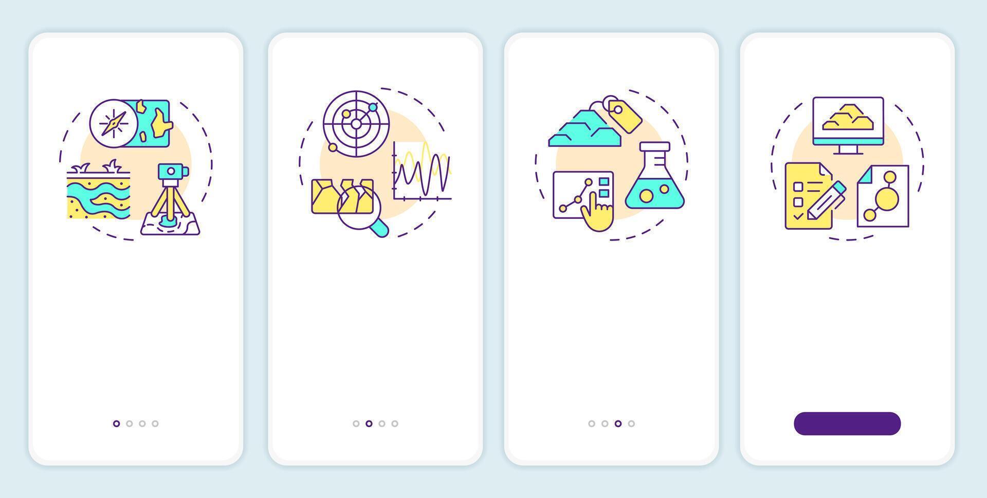 Geotechnical investigation onboarding mobile app screen. Survey walkthrough 4 steps editable graphic instructions with linear concepts. UI, UX, GUI template Pro Vector