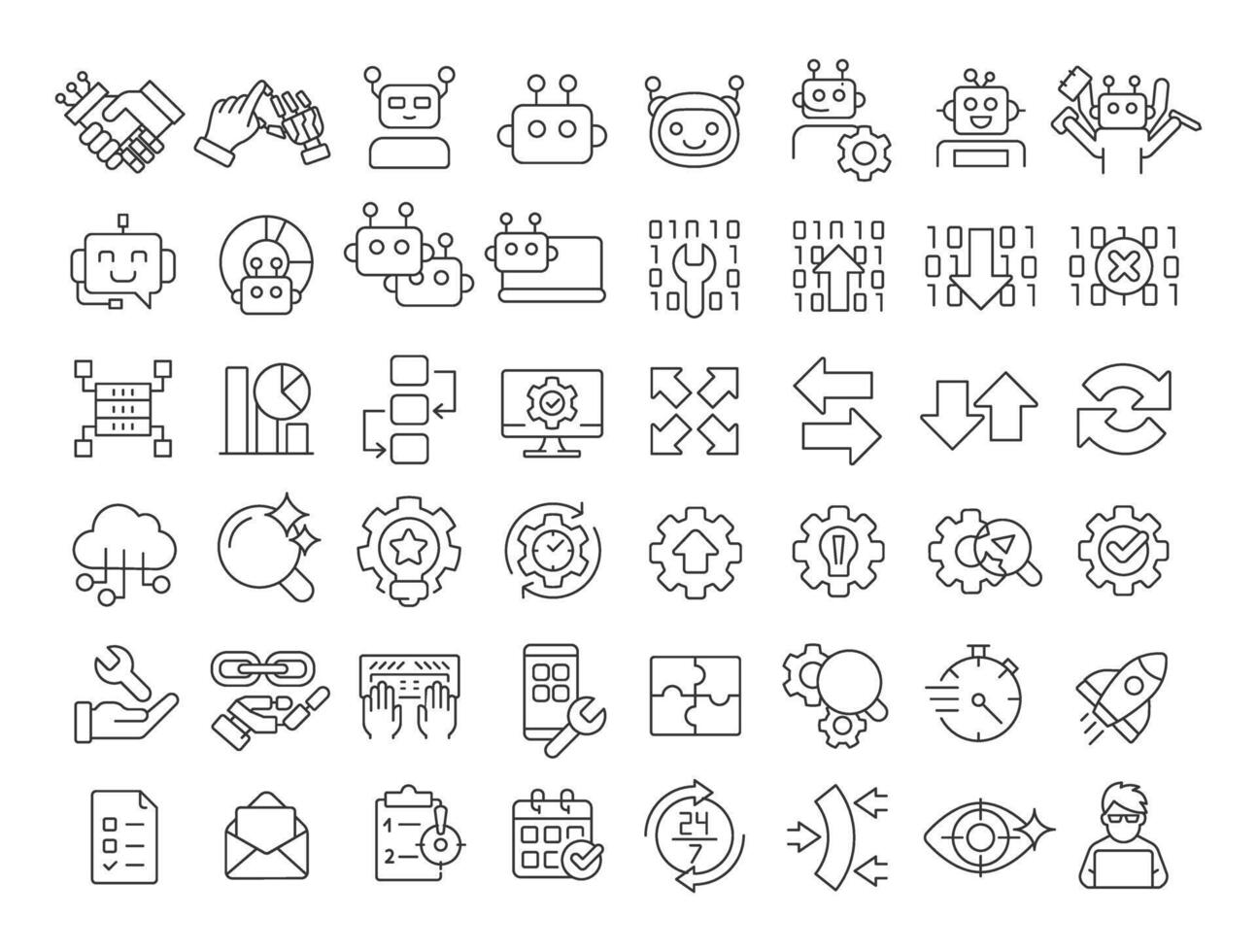 Robotic process automation linear icons set. Technology of workflow optimization. RPA development. Customizable thin line symbols. Isolated outline illustrations. Editable stroke Pro Vector
