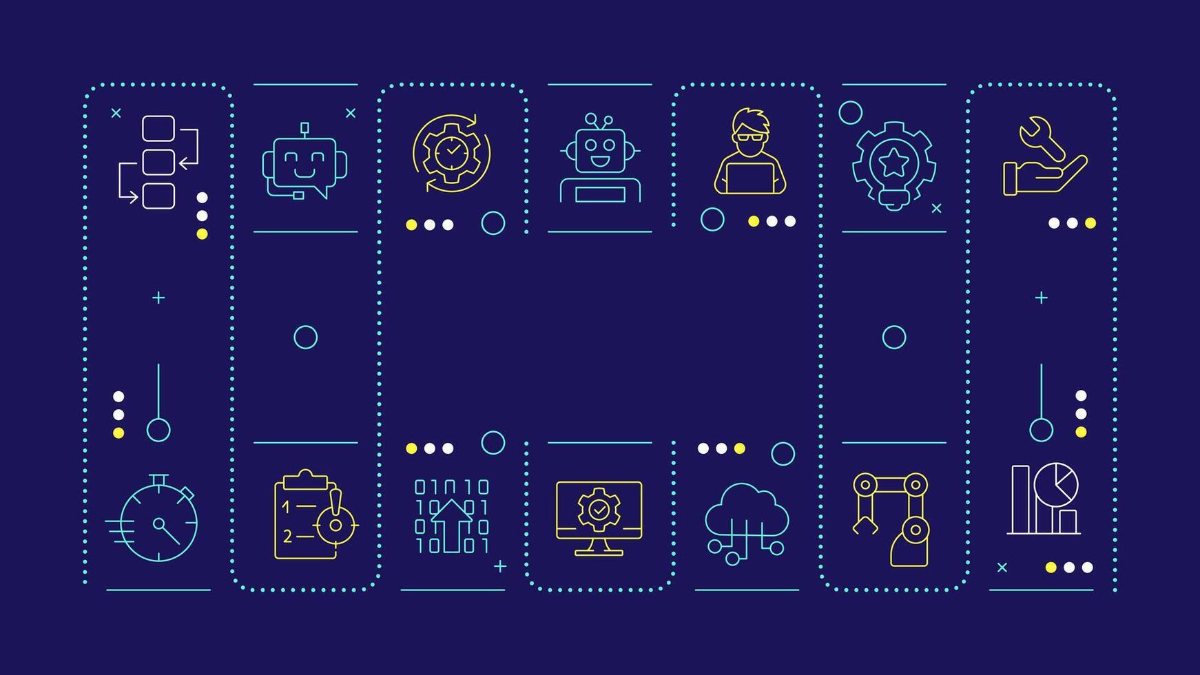 RPA dark blue word concept. Alternative technology of processes control. Optimization maintaining. Horizontal image. Headline text surrounded by editable outline icons Pro Vector