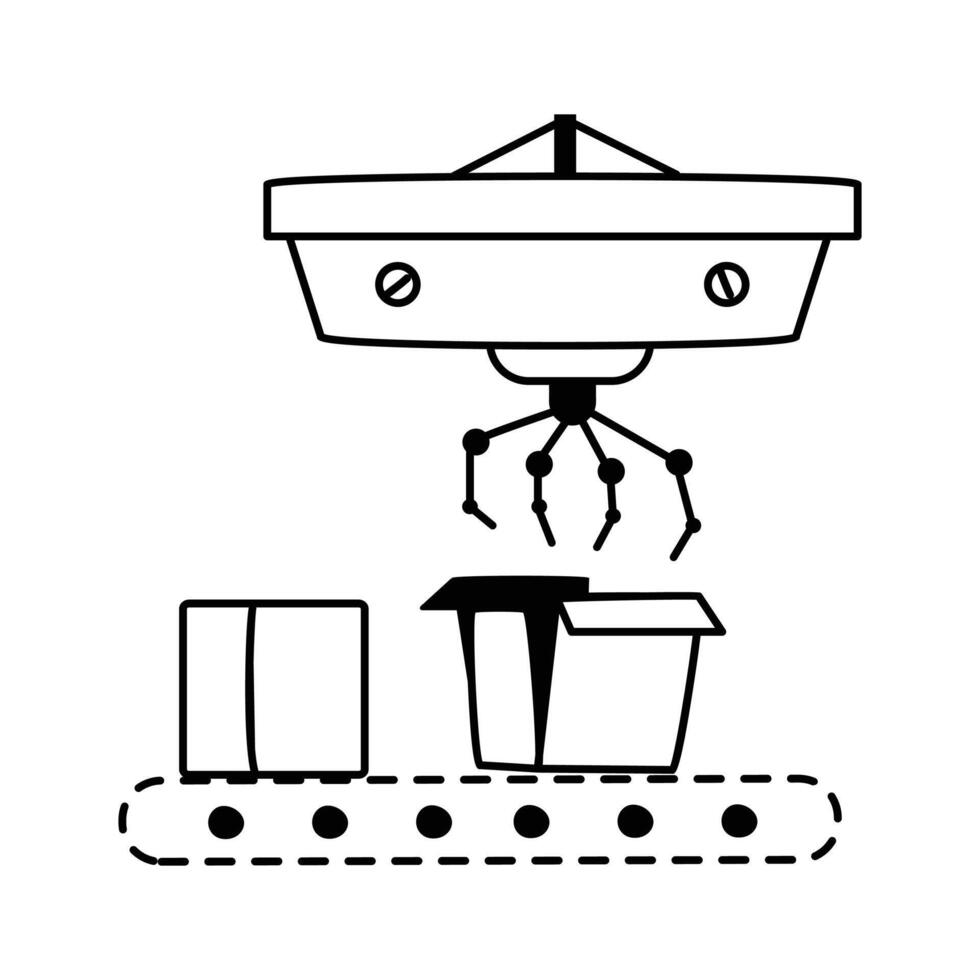 A simple, black and white icon depicts a robotic arm assembly line for boxes Pro Vector