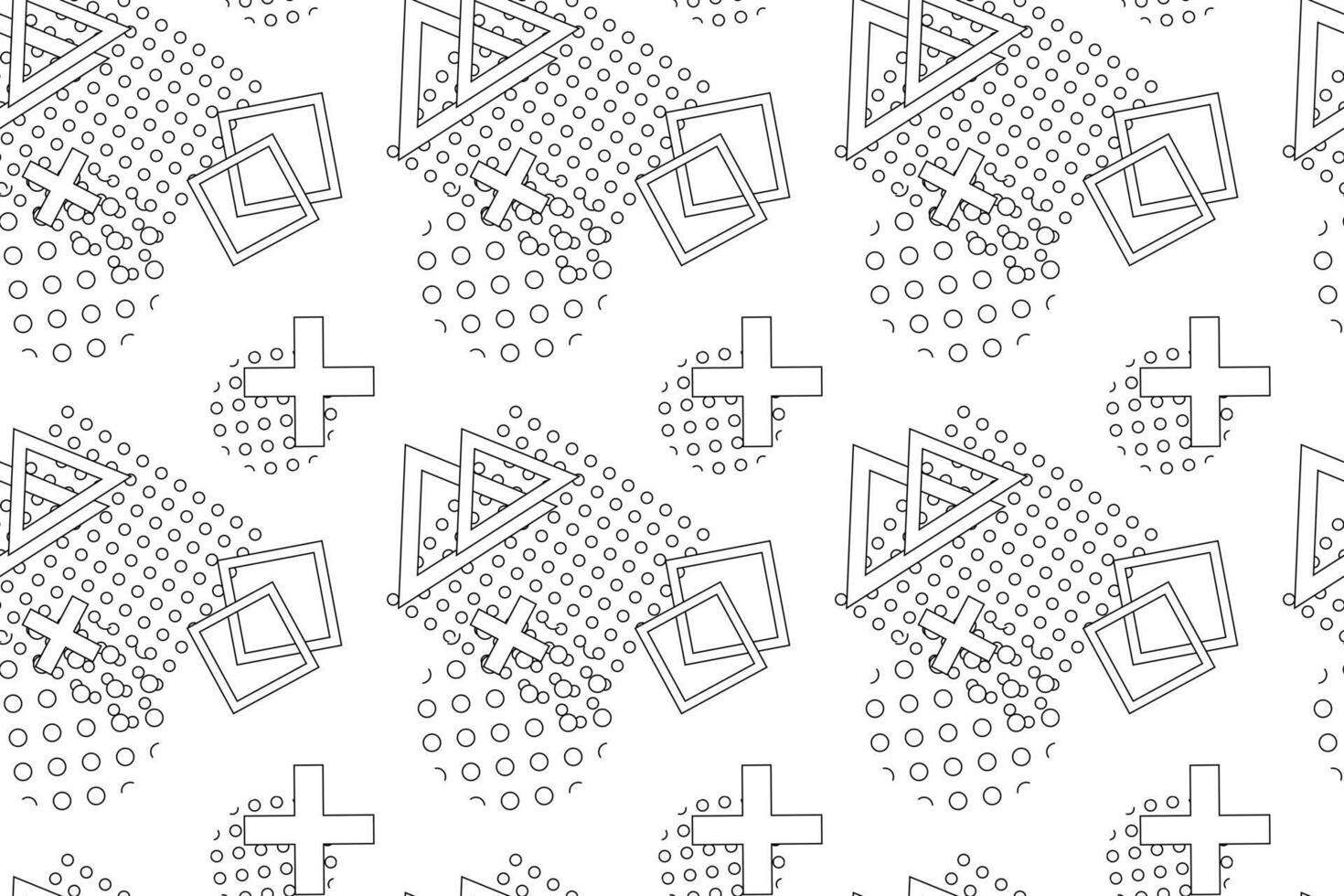 Monochrome seamless design featuring geometric shapes like circles, triangles, squares, and dotted patterns in a minimalist style. Pro Vector