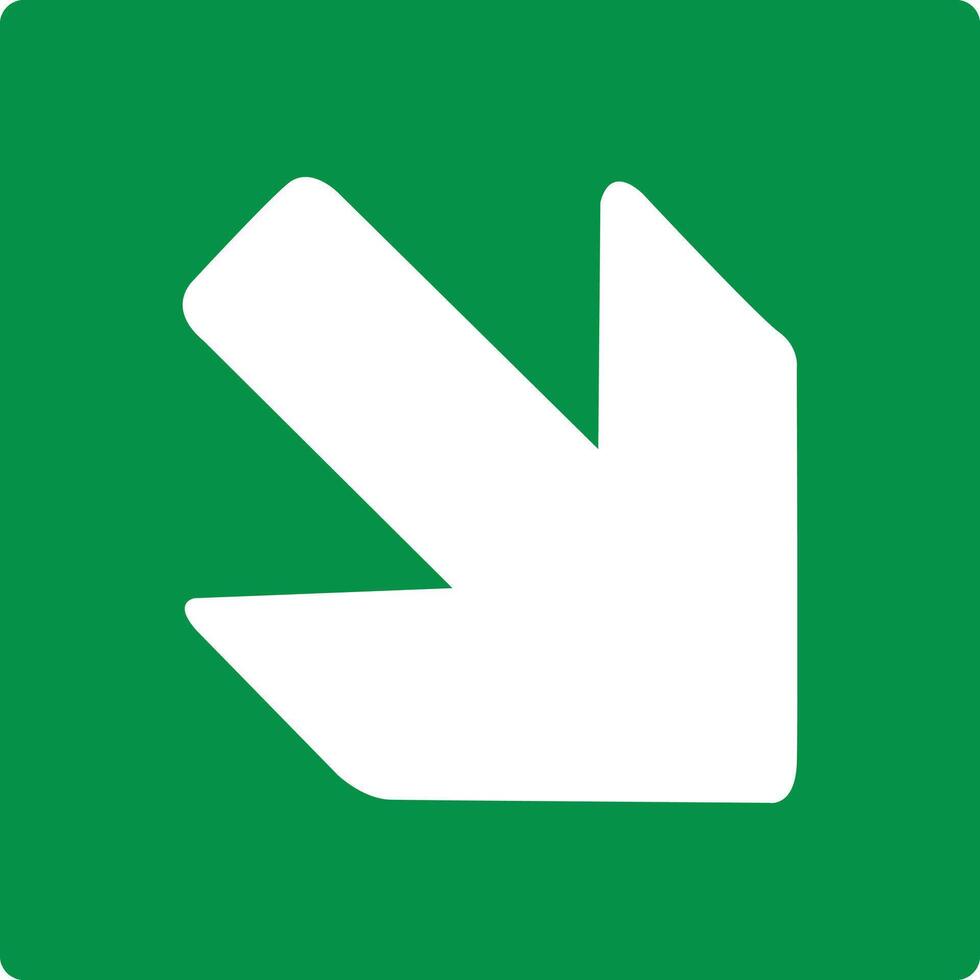 Green sign right arrow. Arrow pointing down to the right. Arrow 45 degrees. Direction movement to exit or shelter in an emergency. Movement to a safe area. Nearest safe point or exit. ISO 7010. Pro Vector