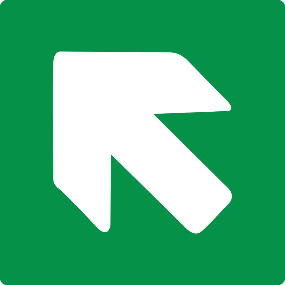 Green sign left arrow. Arrow pointing up to the left. Arrow 45 degrees. Direction of movement to exit or shelter in an emergency. Movement to a safe area. Nearest safe point or exit. ISO 7010. Pro Vector