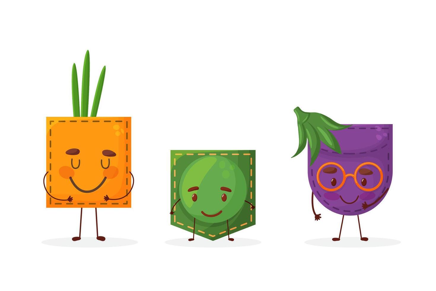 Set egglant peas onion shaped patch pocket. Character pocket egglant peas onion. Isolated on white background. Pro Vector