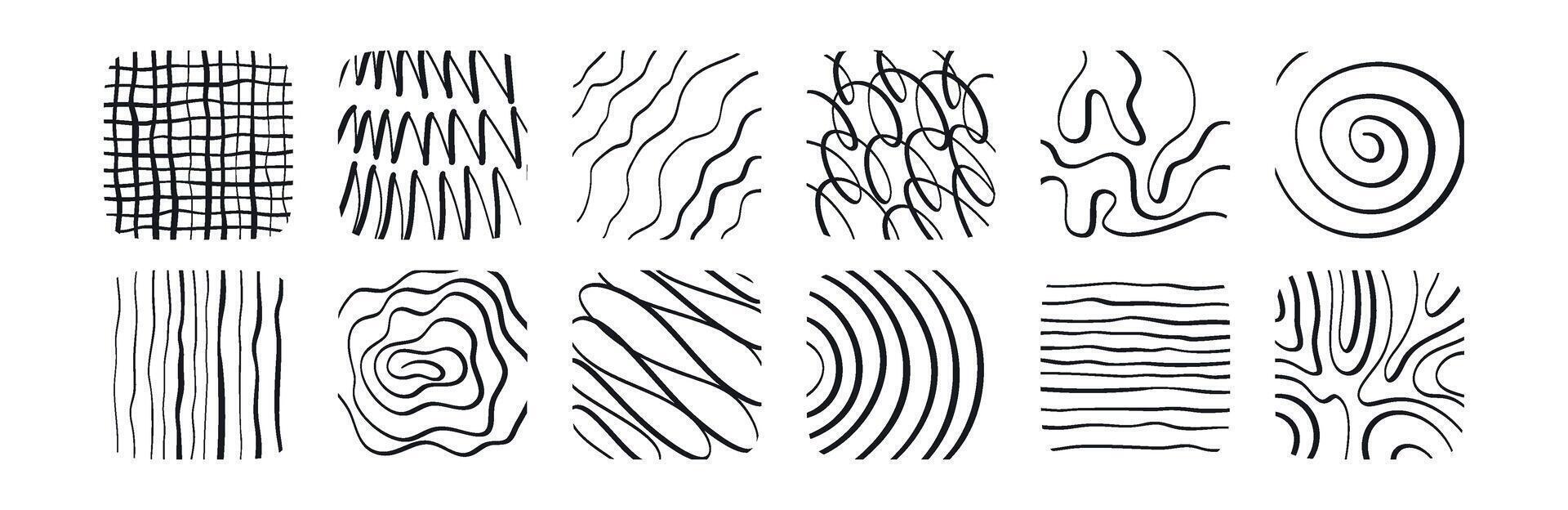 Abstract hand-drawn line collection with brush strokes and spirals featuring modern sketchy doodles with texture and geometric symbols isolated on white background Pro Vector