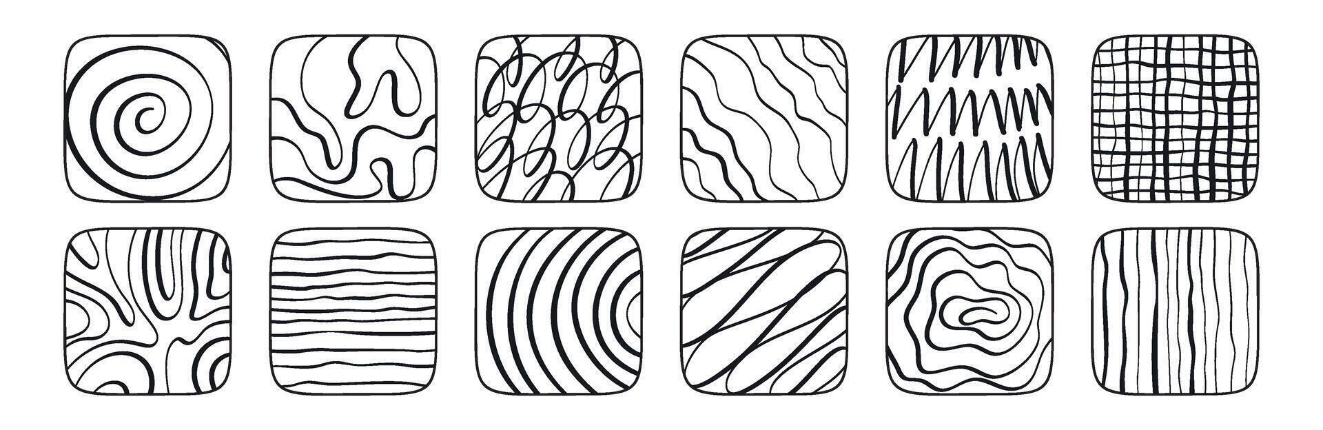 Abstract line set with brush textures and grunge spirals featuring hand-drawn geometric patterns and graphic curves for doodle-inspired designs isolated on white background Pro Vector