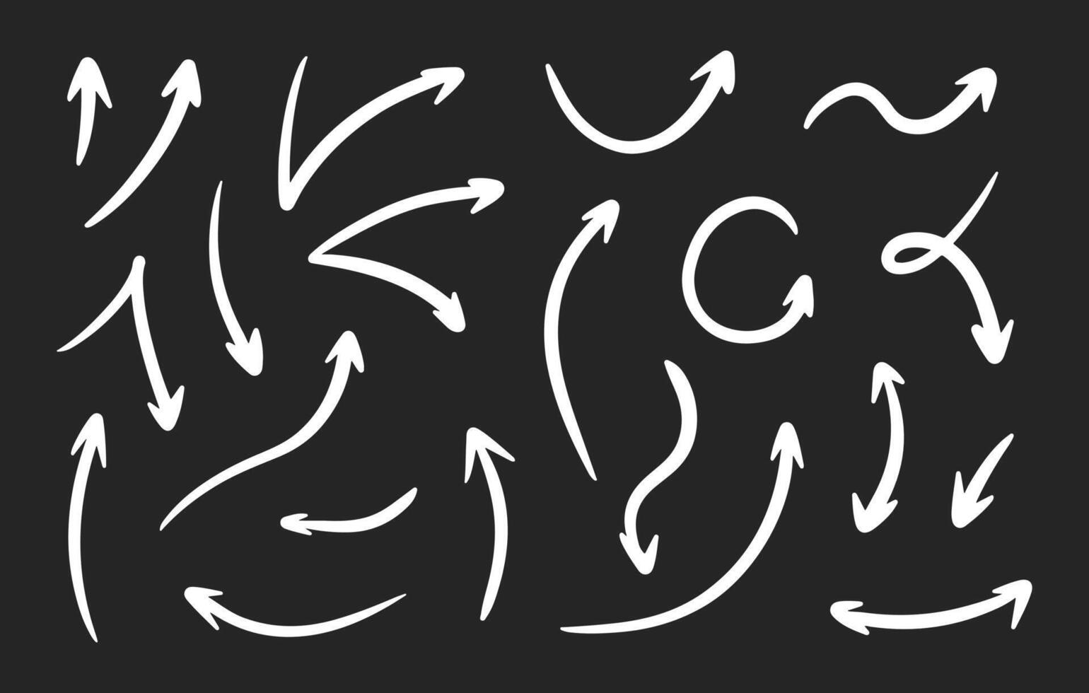 Hand drawn arrows set. Scribble lines, swirls arrows, scrawls. Doodle drawing. Direction pointers on black background Pro Vector