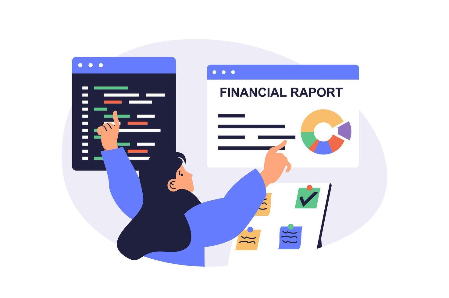 Multitasking web concept with flat cartoon people for website design. Woman doing work in office, coding and programming at screens, making financial reports, planning tasks. illustration. Pro Vector
