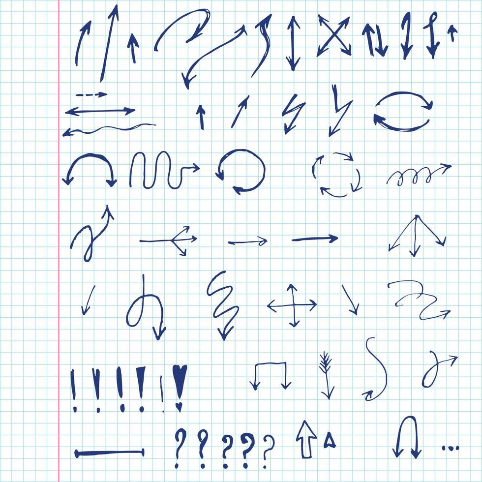 Hand drawn sketch ink arrows, question mark, exclamation mark set on notebook page background. Vector illustration design elements