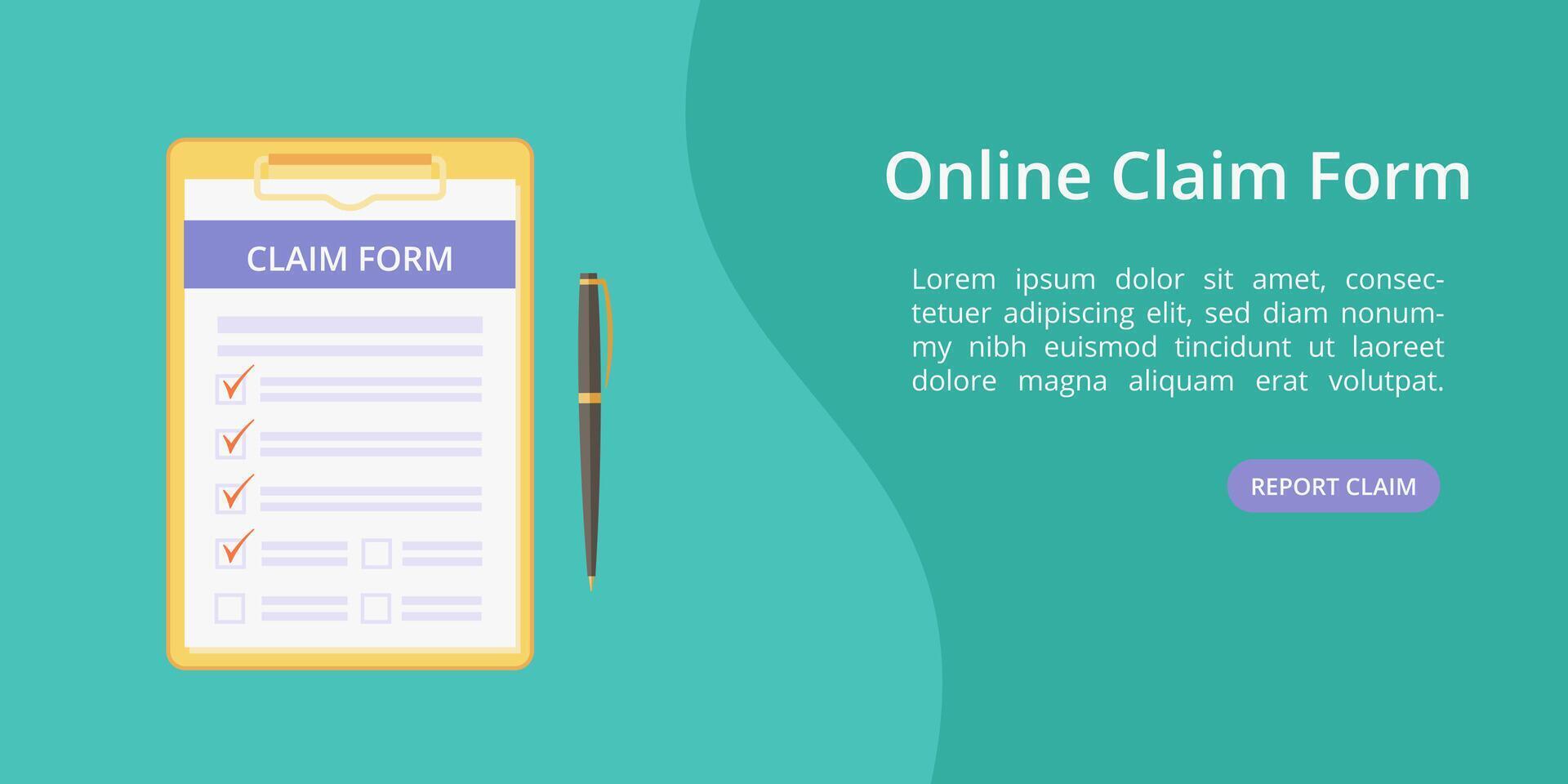 Claim form on clipboard with pen landing page concept. Website page template, check list on board with clip. Online claim form service landing concept green illustration with pen and clipboard Pro Vector
