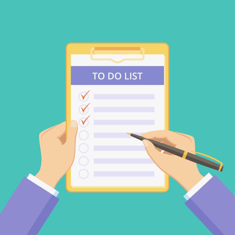 Todo list on clipboard with hands illustration. Checklist document with task to do on board with paper clip. Flat man hands holding pen and clipboard with todo list on green background. Pro Vector