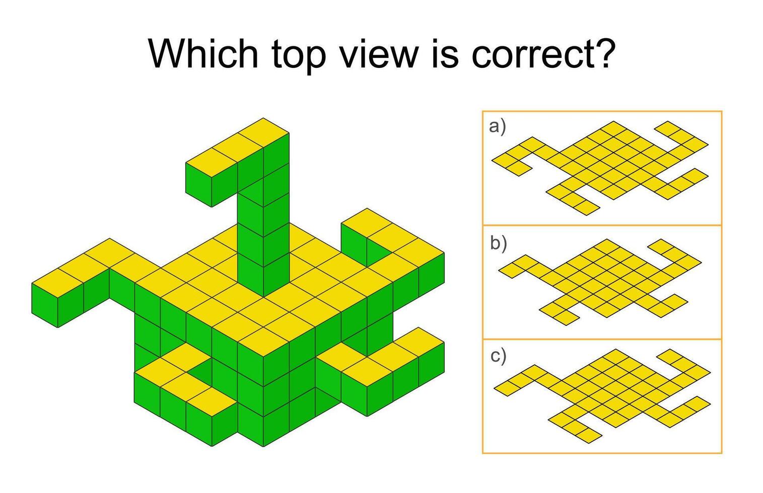 Logic puzzle for children. Which top view is correct IQ training test. Answer is C. Pro Vector