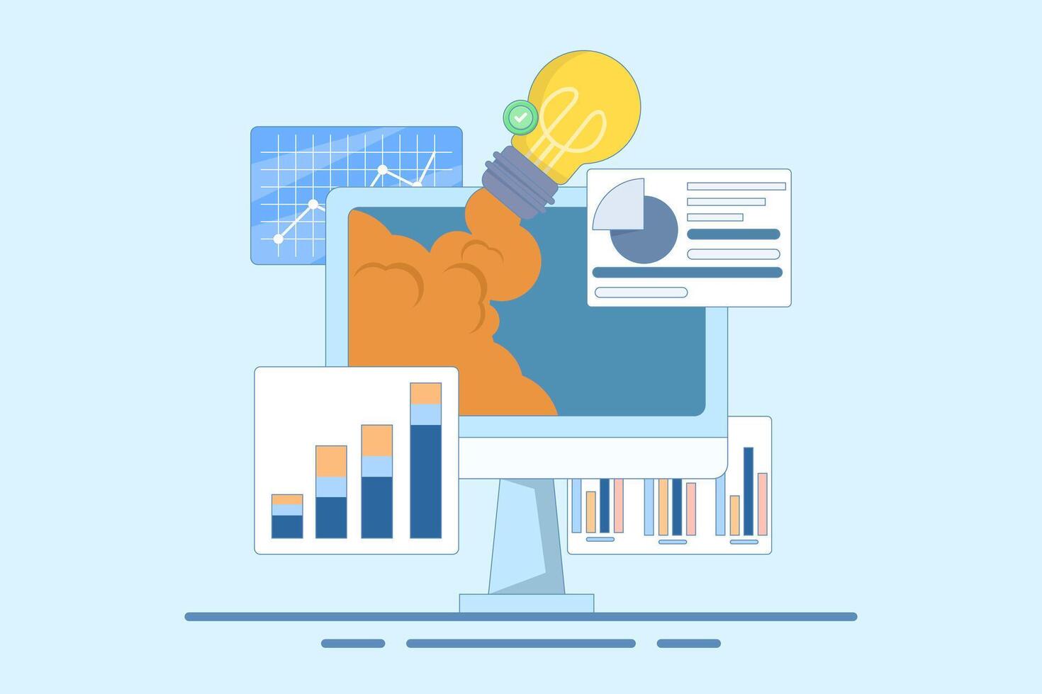Analyzing Data Concept, Creating New Ideas. Working on New Startup, Business Mission, Creative Ideas and Analysis. Researching new creative ideas. Flat Cartoon Illustration on Background. Pro Vector