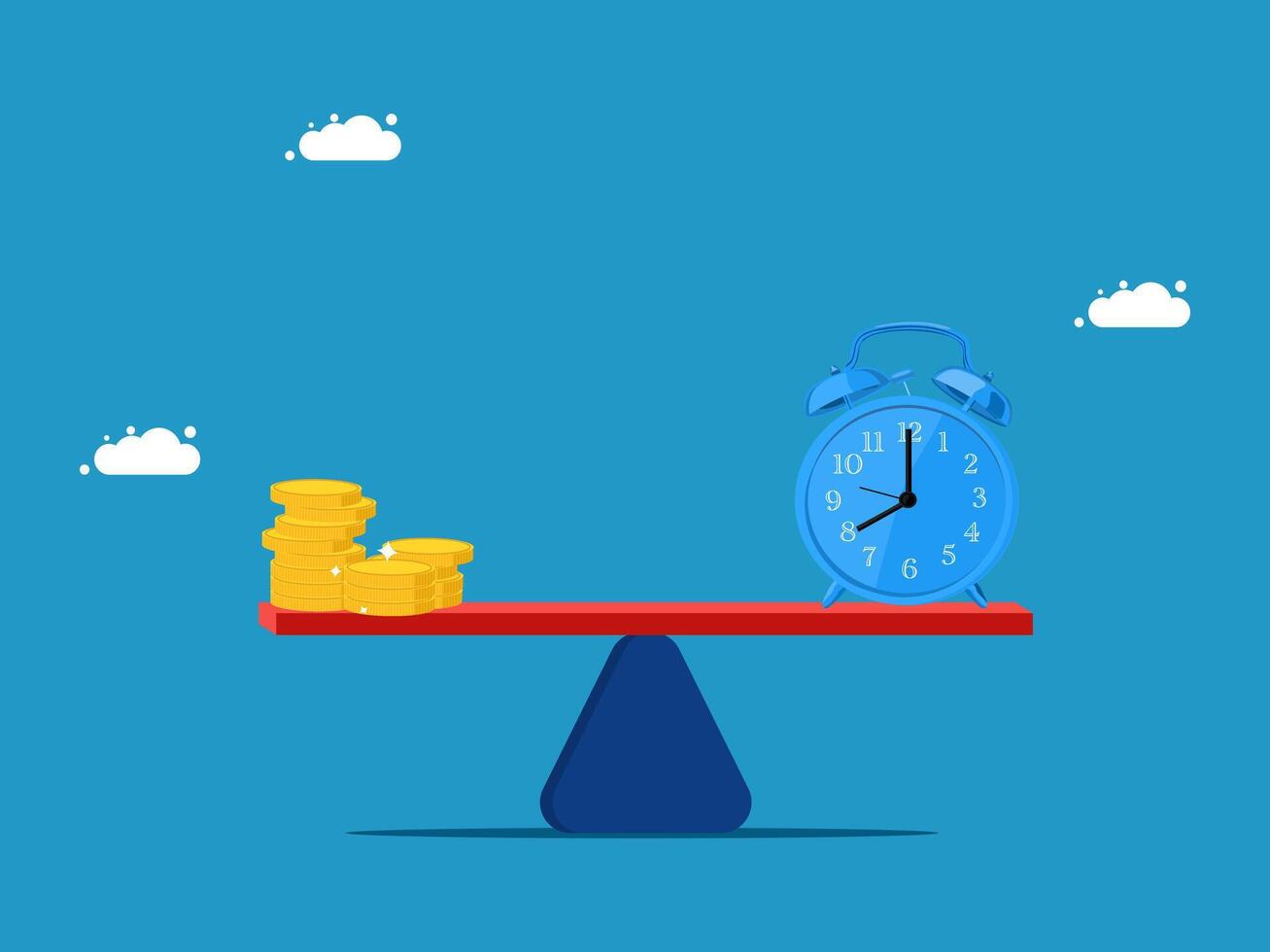 time and money concept with alarm clock and coins on a balance scale Pro Vector