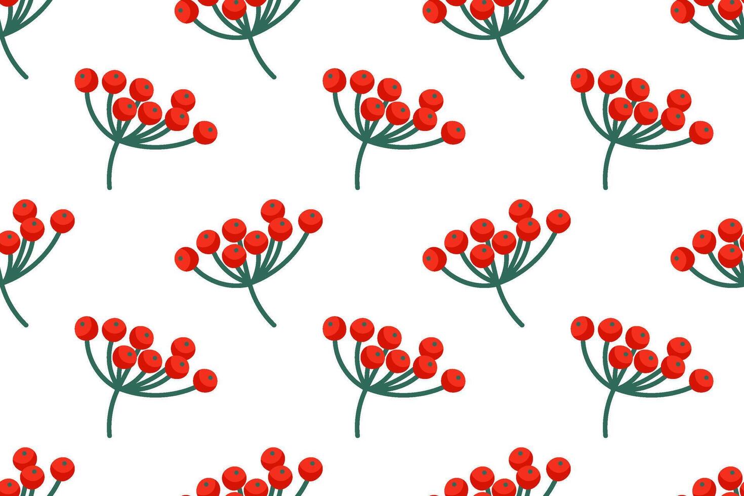 Bright red berries with green stems arranged in a seamless pattern on a white background Pro Vector