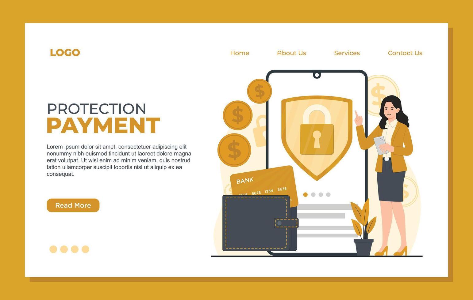 Landing page template concept showcasing secure online payment protection. Featuring a smartphone with a shield, wallet, and financial icons, symbolizing safe transactions and cybersecurity measures Pro Vector