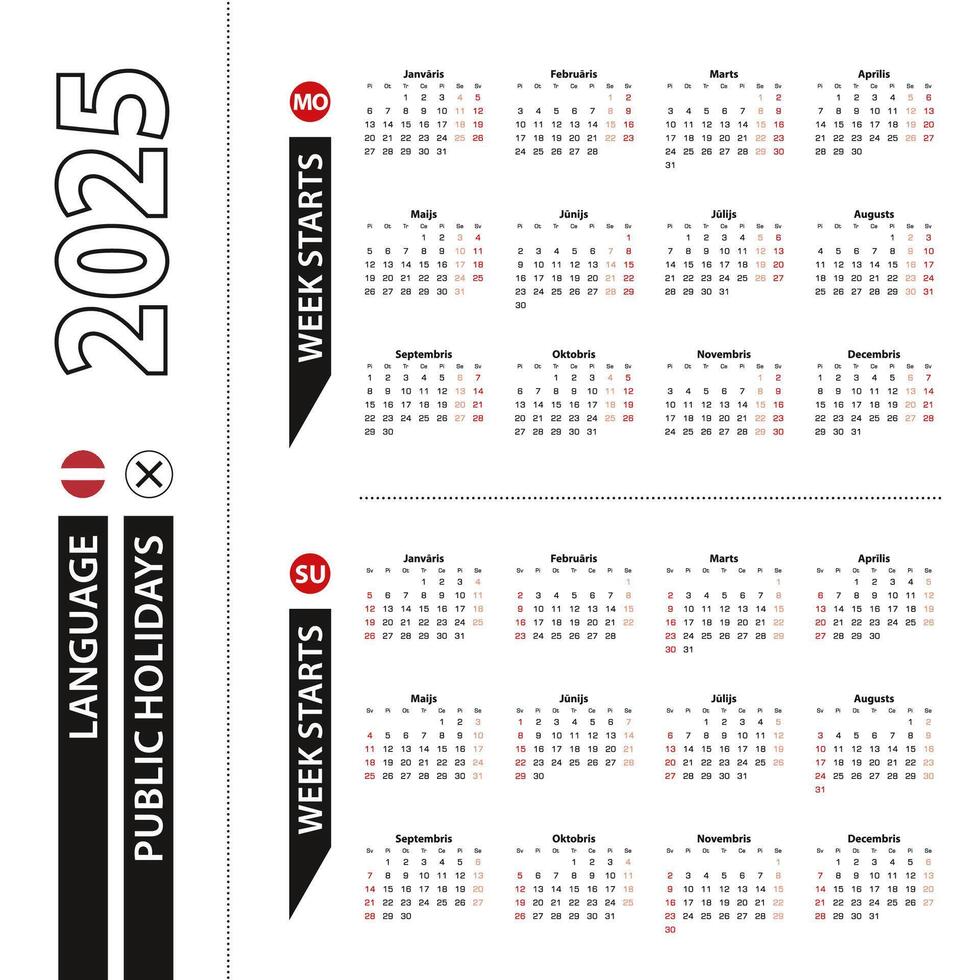 Two versions of 2025 calendar in Latvian, week starts from Monday and week starts from Sunday. Pro Vector