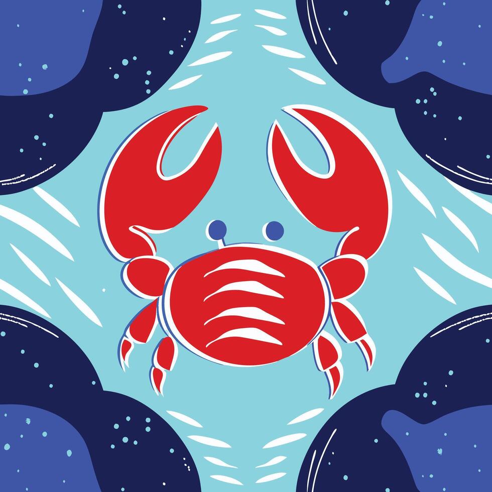 Red Crab on Teal Background with Abstract Shapes Free Vector