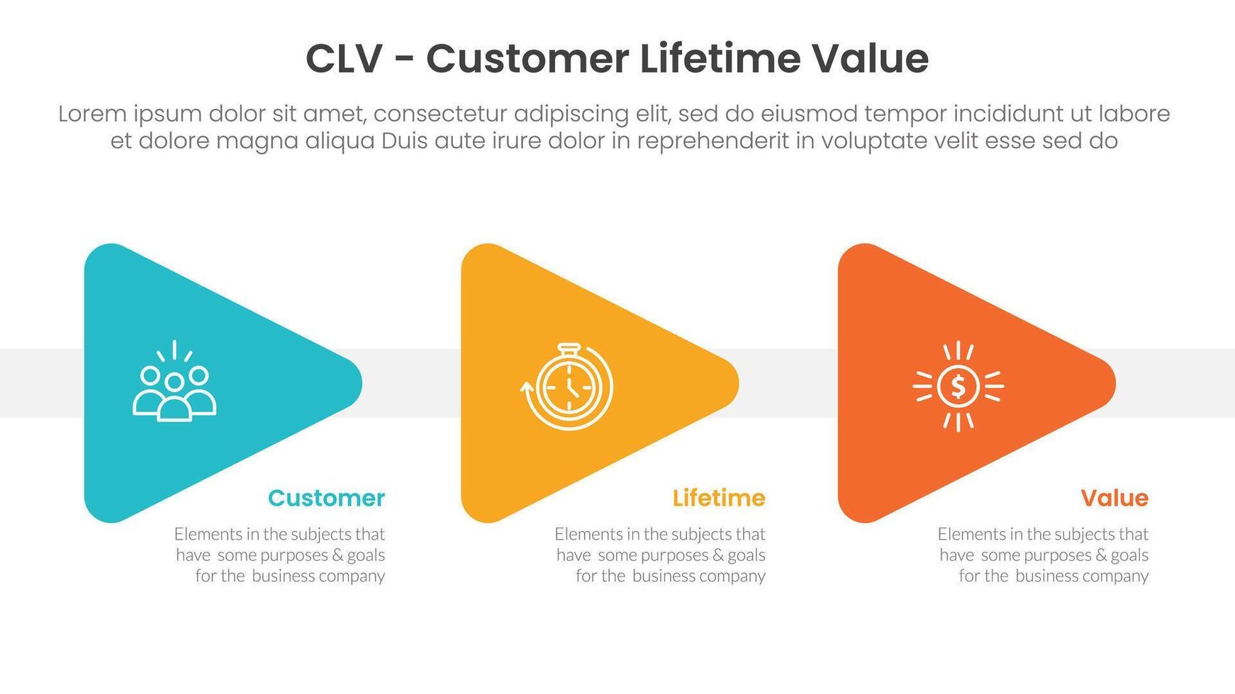 CLV customer lifetime value infographic 3 point with triangle arrow right direction for slide presentation vector