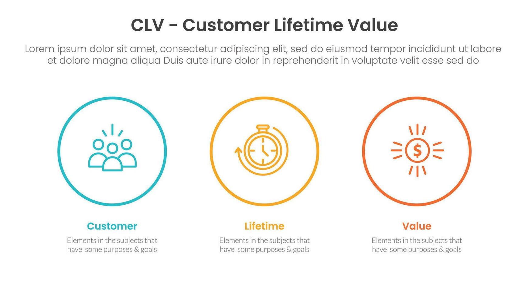 CLV customer lifetime value infographic 3 point with big circle outline horizontal for slide presentation vector
