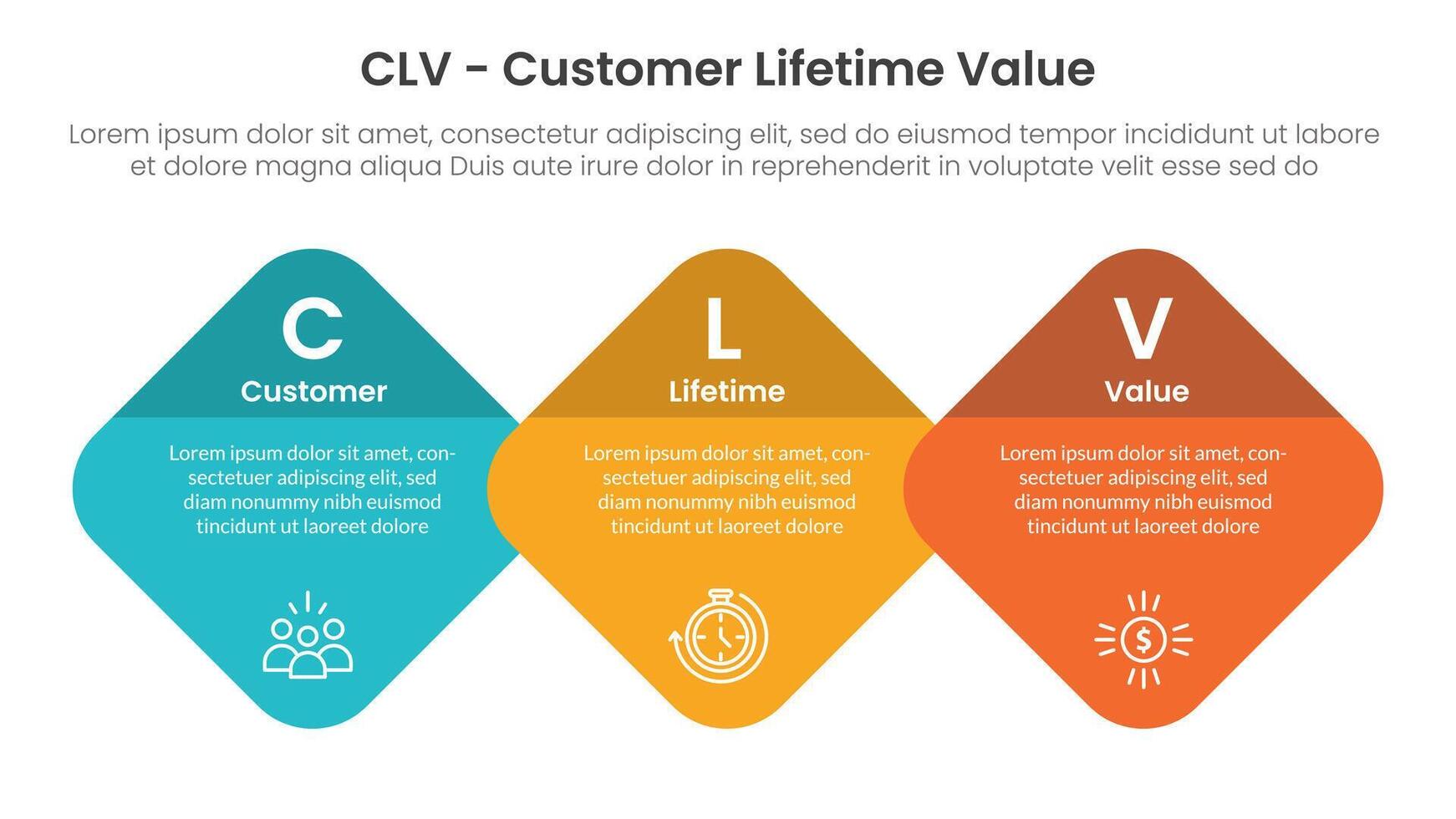 CLV customer lifetime value infographic 3 point with round diamond on horizontal direction for slide presentation vector