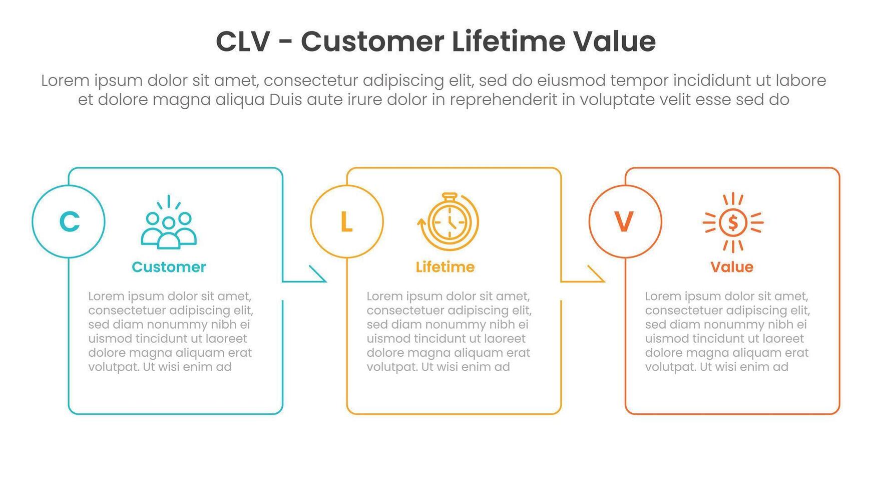 CLV customer lifetime value infographic 3 point with box outline table arrow right direction for slide presentation vector