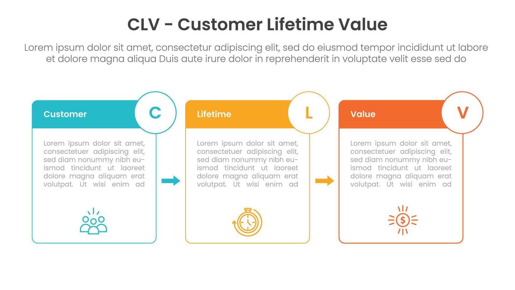CLV customer lifetime value infographic 3 point with box outline and badge arrow for slide presentation vector