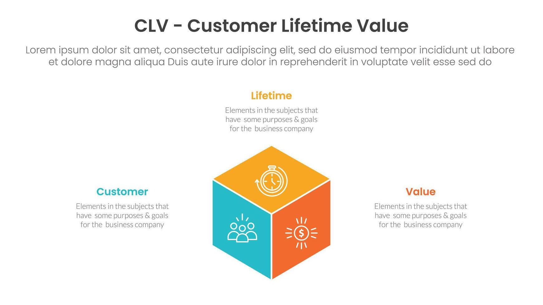 CLV customer lifetime value infographic 3 point with 3d box shape center for slide presentation vector