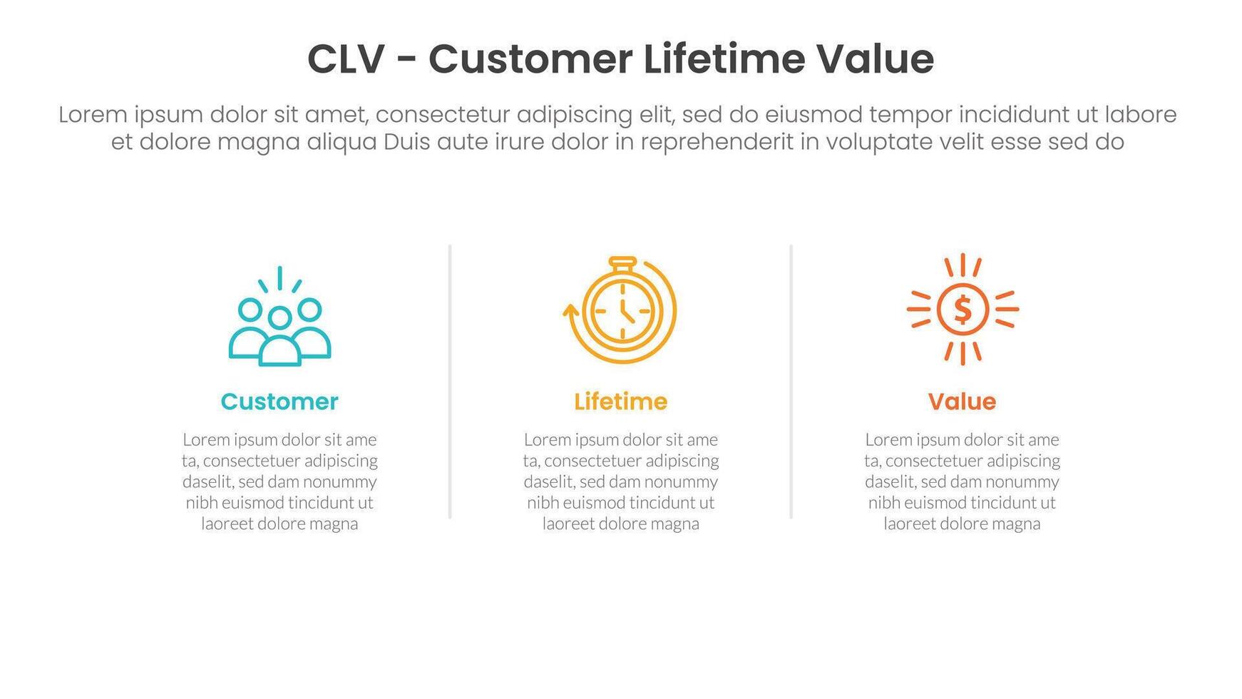 CLV customer lifetime value infographic 3 point with horizontal clean information with line divider for slide presentation vector