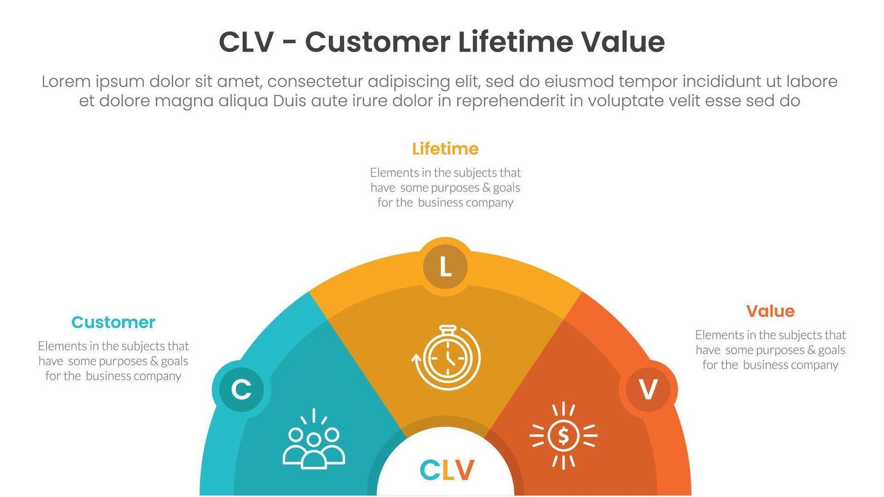 CLV customer lifetime value infographic 3 point with half circle horizontal with circle badge for slide presentation vector