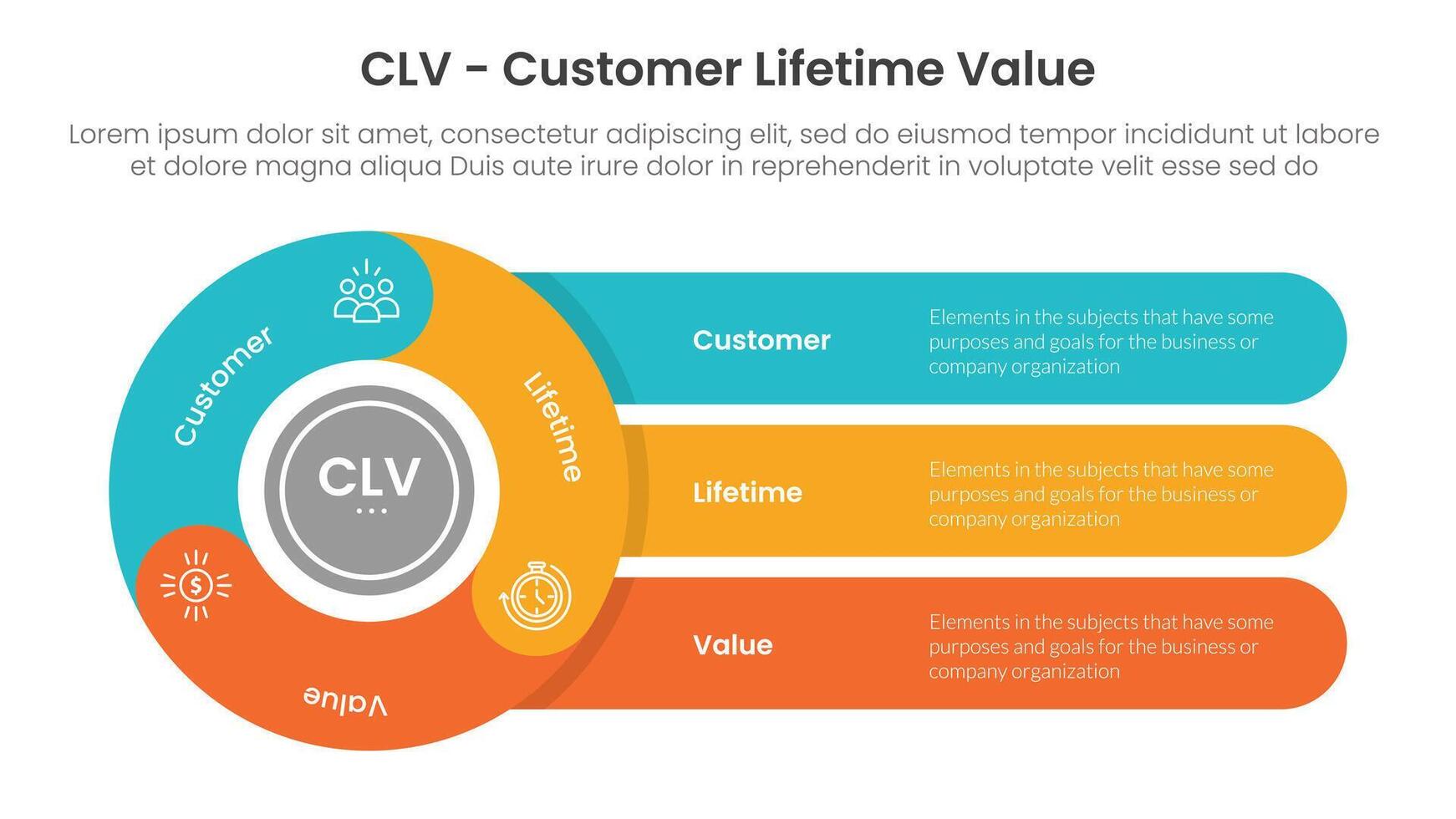 CLV customer lifetime value infographic 3 point with flywheel cycle circular with round rectangle for slide presentation vector