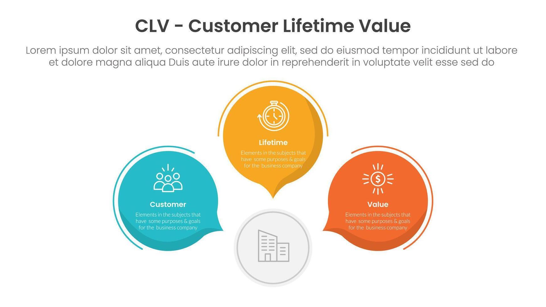 CLV customer lifetime value infographic 3 point with circle callout comment shape for slide presentation vector