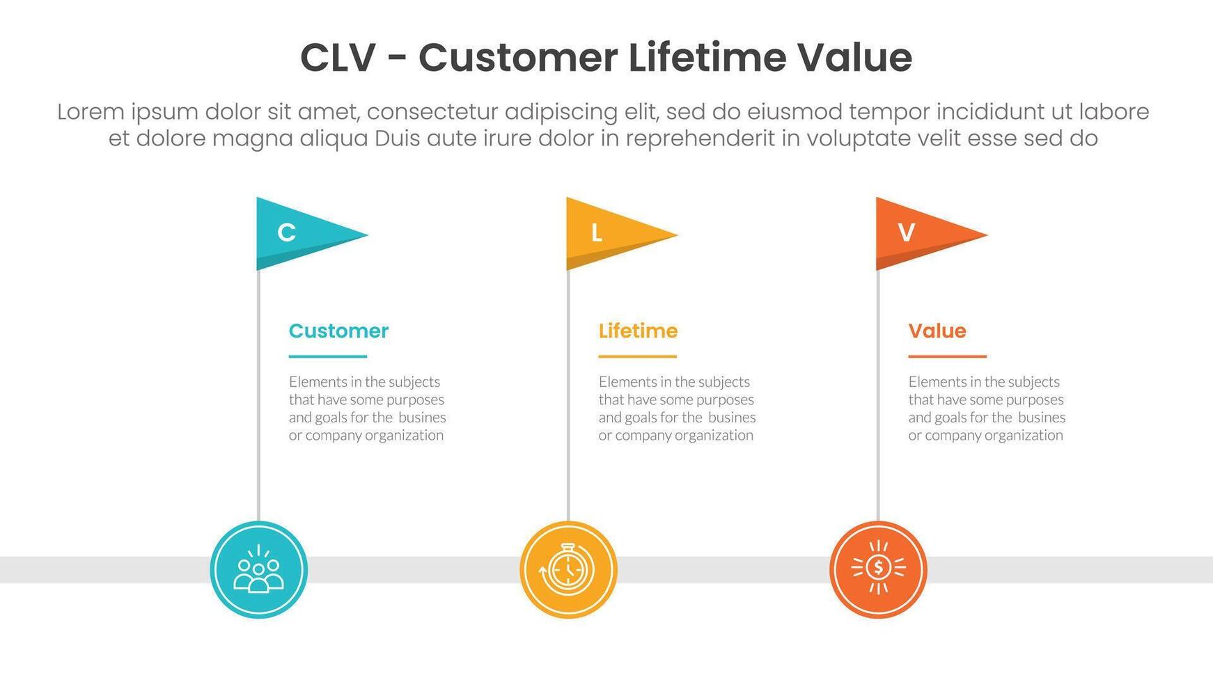 CLV customer lifetime value infographic 3 point with timeline flag horizontal for slide presentation Pro Vector