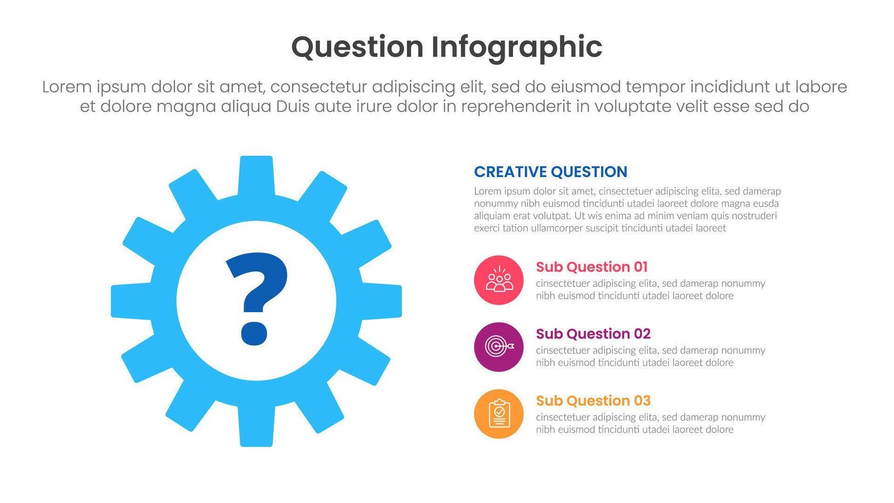 question infographic template banner with big gear and stack point list description with 3 points for slide presentation vector