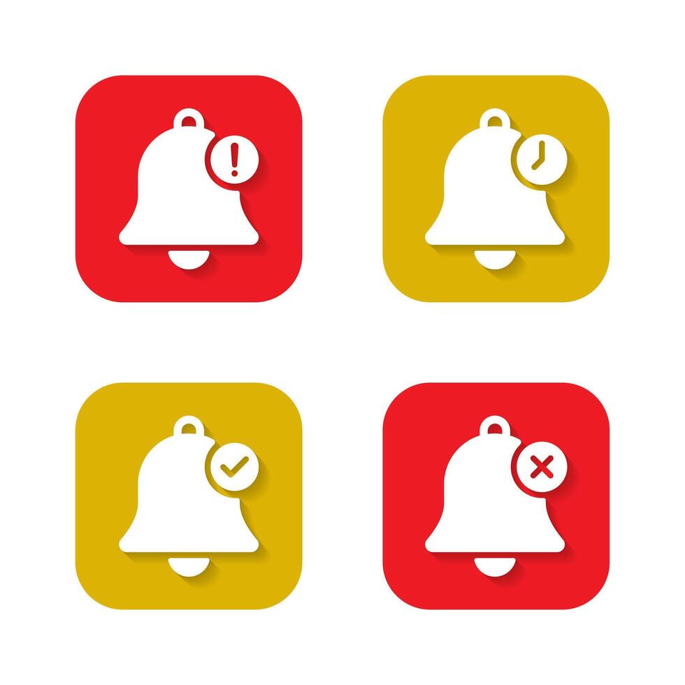 Bell with exclamation mark, time, checkmark, and cross mark icon with long shadow. Notification symbol on square background Pro Vector