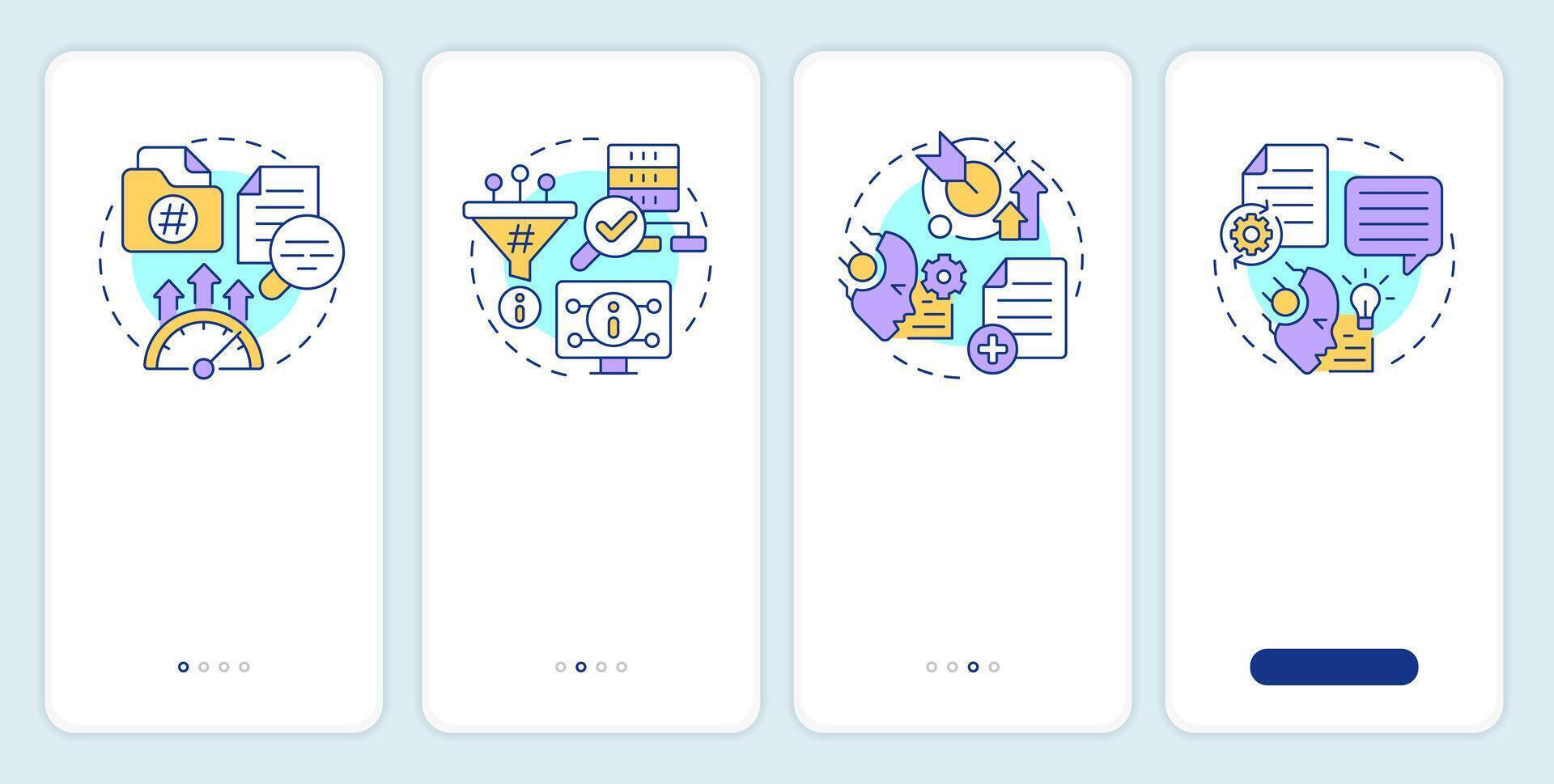 RAG process onboarding mobile app screen. Information walkthrough 4 steps editable graphic instructions with linear concepts. UI, UX, GUI template Pro Vector