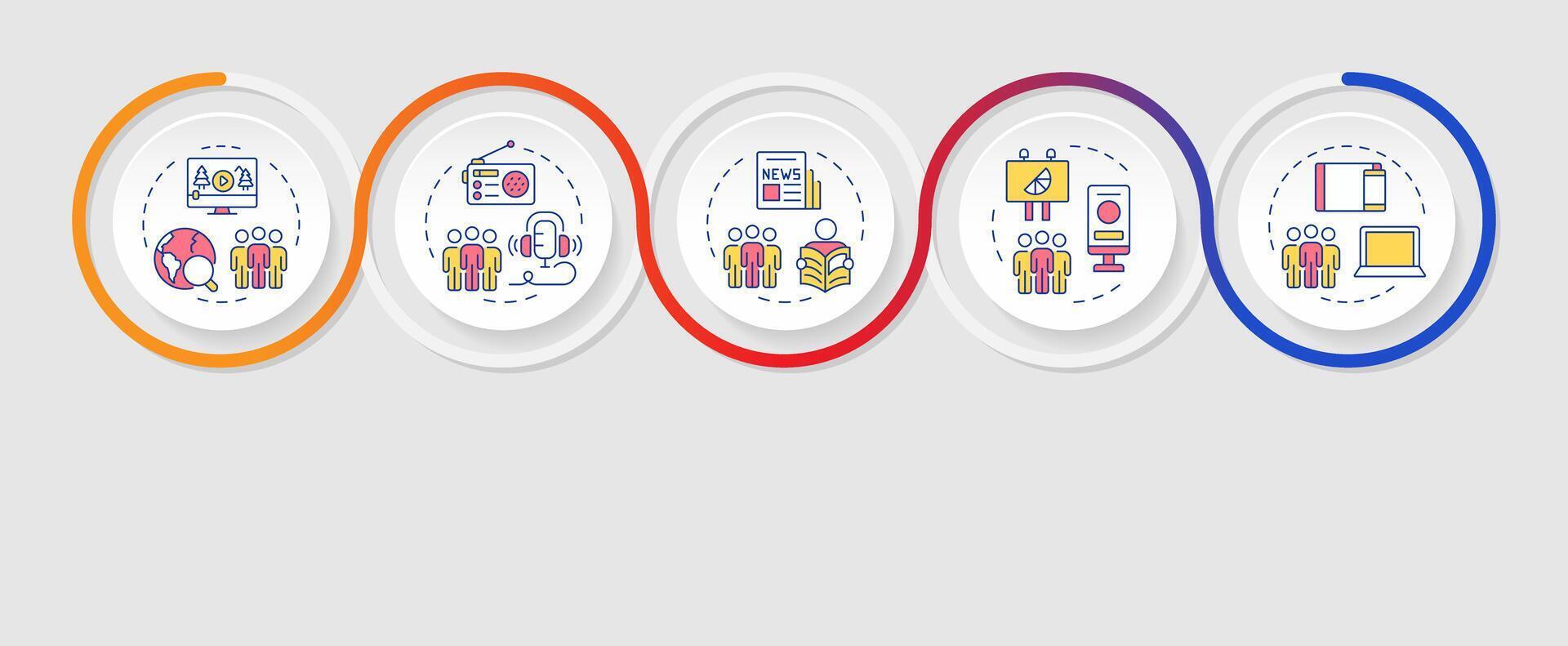 Audience measurement methods infographics circles sequence. Assessment of customers. Business. Visualization layout with 5 steps. Info chart loop process presentation Pro Vector