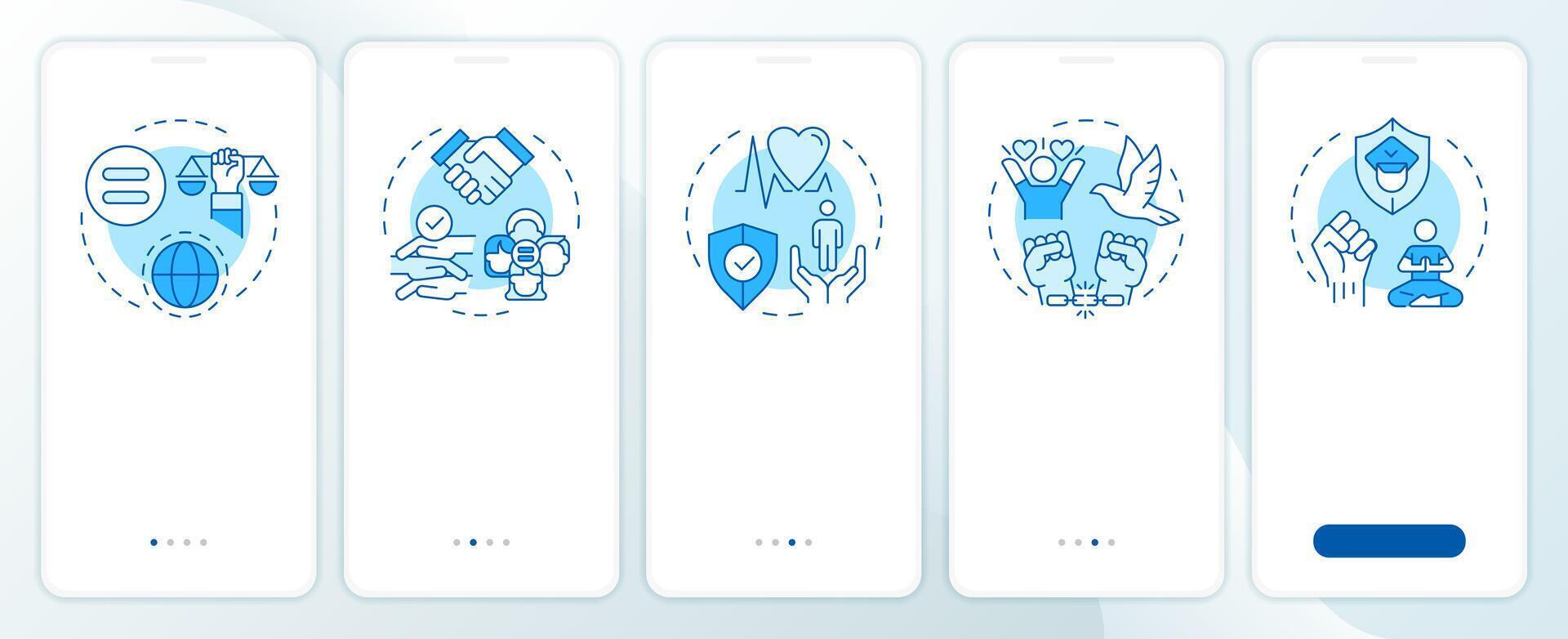 Social freedom rights blue onboarding mobile app screen. Walkthrough 5 steps editable graphic instructions with linear concepts. UI, UX, GUI template Pro Vector