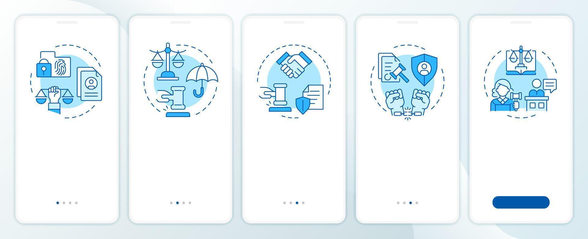 Legal law equality blue onboarding mobile app screen. Walkthrough 5 steps editable graphic instructions with linear concepts. UI, UX, GUI template Pro Vector