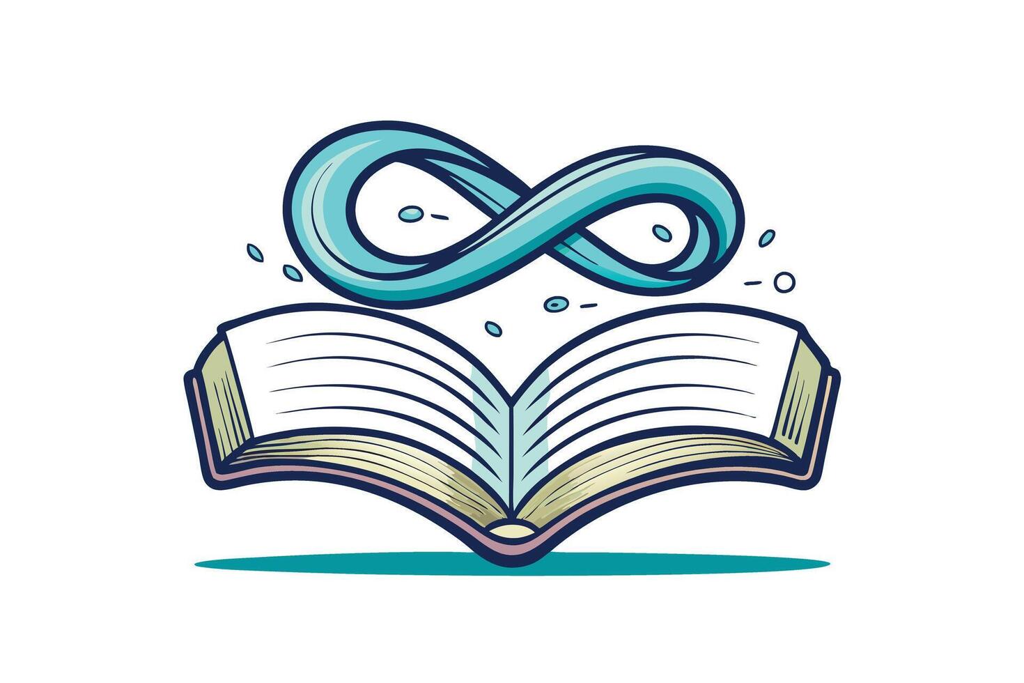 Creative illustration of an open book with an infinite spiral hovering above, symbolizing endless knowledge and infinite learning potential vector
