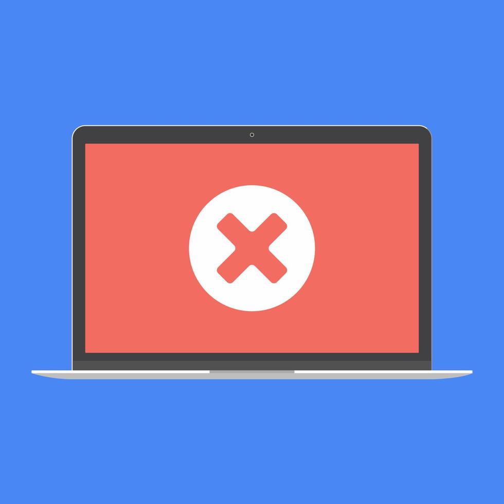 Modern device - laptop, computer or netbook pc flat design with check mark cross x on the screen icon vector illustration. No keybord technology concept of error on screen isolated on blue background Pro Vector