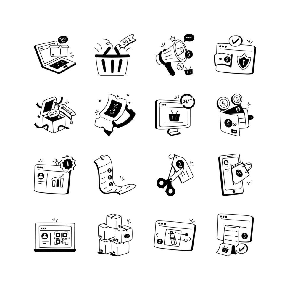 A collection of simple, hand drawn icons representing various e commerce and retail concepts Pro Vector