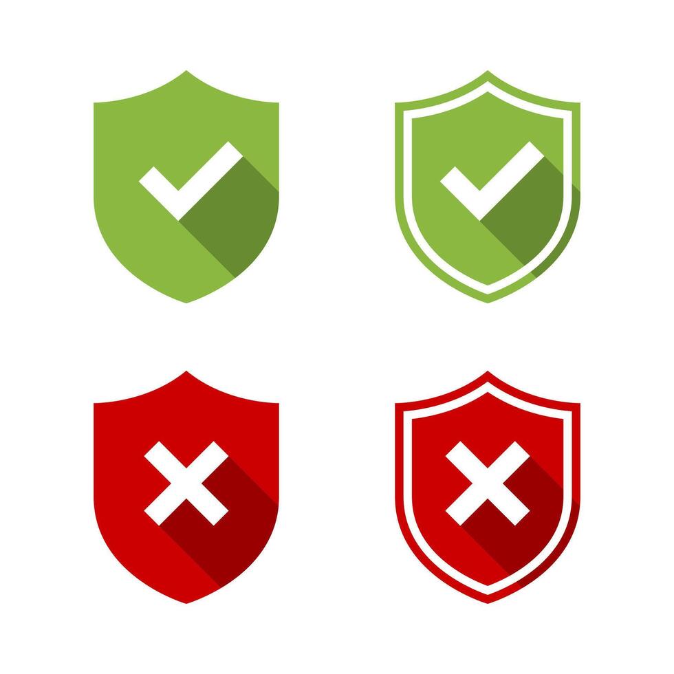 Shield check and cross mark icon with long shadow. Defense, protection with checkmark and x sign symbol Pro Vector