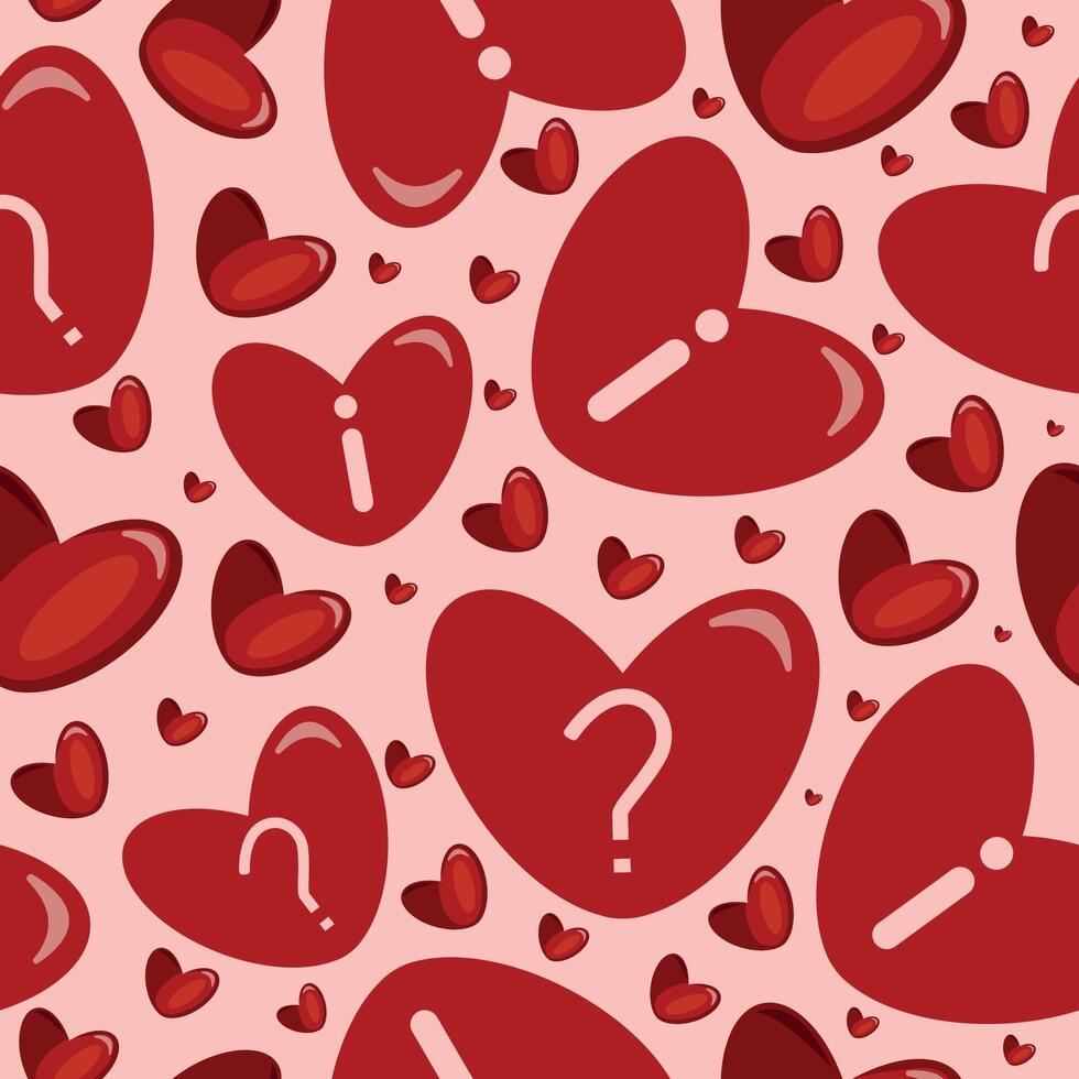 seamless pattern with pink information icon and question mark on red heart placed randomly on pink background, valentine's day pattern Pro Vector
