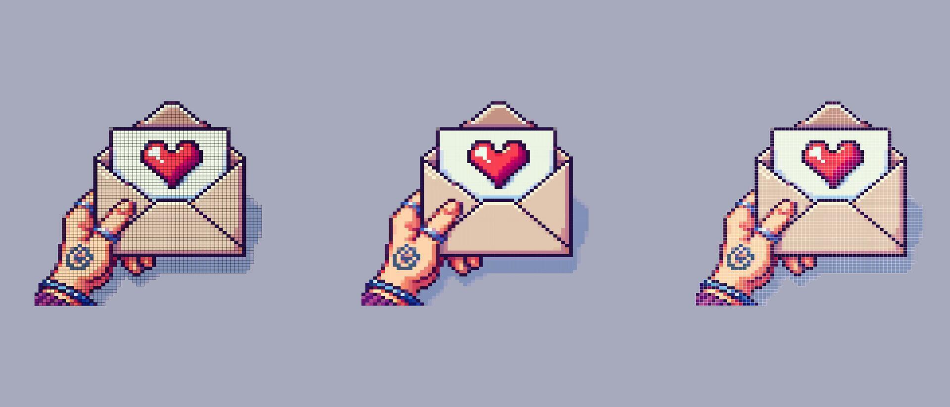 Pixel art of a hand holding an open envelope with a red heart inside on a light purple background for Valentine's Day. Pro Vector