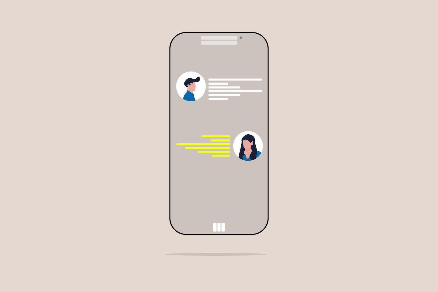 Communication mobile application chat screen concept. Happy characters using, holding smartphones, messenger, texting messages at distance Pro Vector