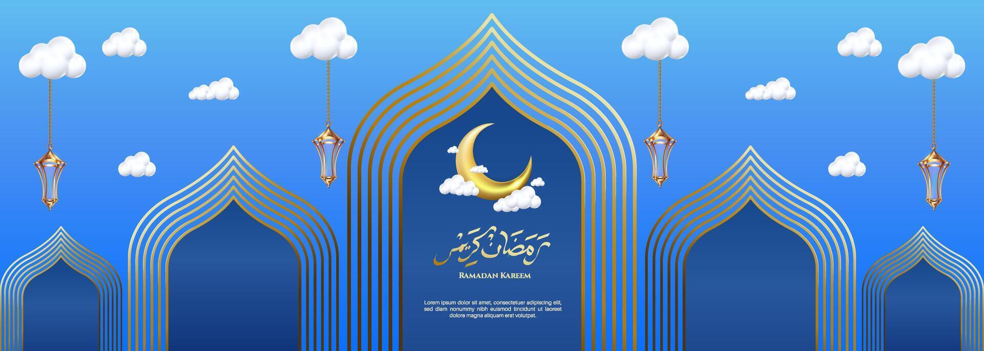 Ramadan Kareem banner featuring gold 3D frame, background with elegant arabesque patterns, and hanging golden lanterns. Pro Vector