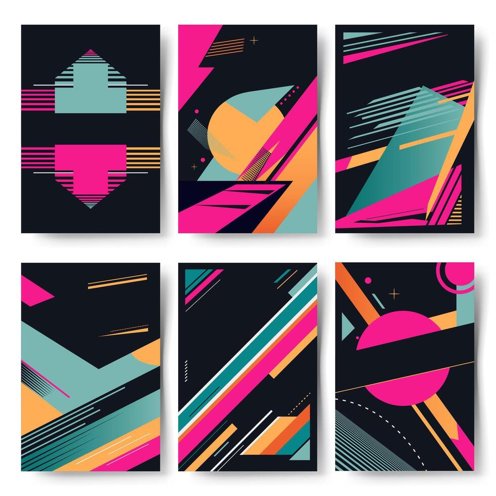 Set of abstract backgrounds with place for text. Dark background and bright figures. Trendy geometrical shapes Pro Vector