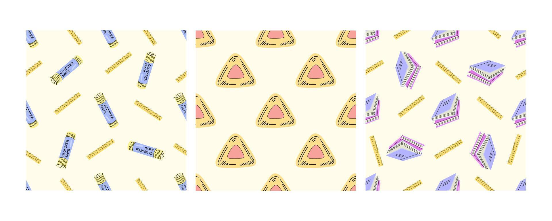 Seamless school patterns with glue sticks, triangles, and books in flat doodle style Pro Vector