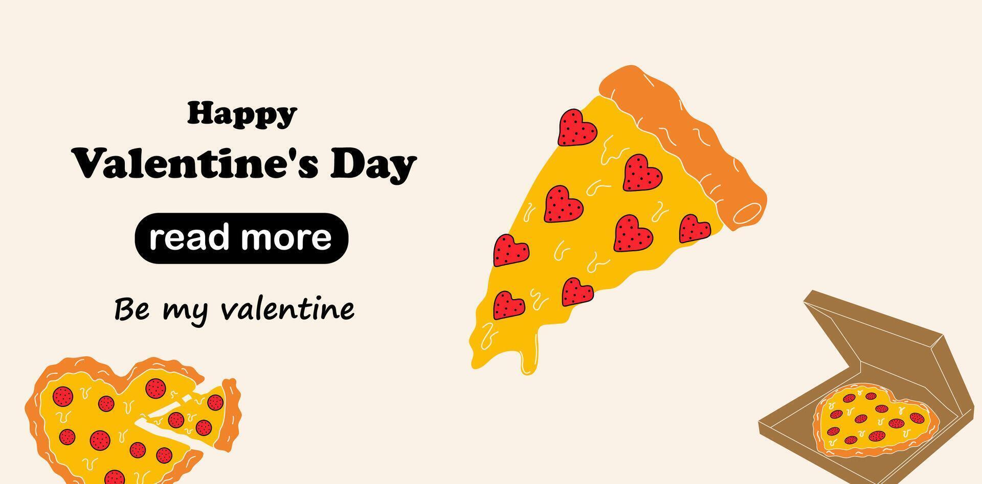 Web page design template. Pizza in the form of a heart. Happy Valentine's Day Pro Vector